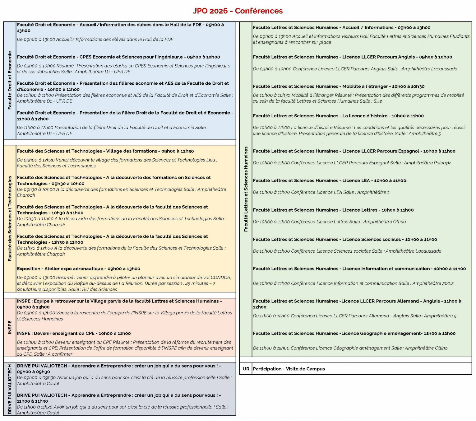 Vous êtes futur•e•s étudiant•e•s, étudiant•e•s en réorientation, ou en reprise d’études ? L’Université de La Réunion vous accueille les 07, 14 et 28 février 2026Rendez-vous incontournable de notre établissement à destination des personnes souhaitant suivre l’une de ses formations, les Portes Ouvertes de l’université sont une belle occasion de découvrir les campus et sites de l’Université de La Réunion.Nos dates : Campus du Moufia📅 07 février 2026 🕘 9h00 – 13hCampus du Tampon📅 14 février 2026 🕘 9h – 13hCampus de Terre-Sainte (IUT – ESIROI – Faculté de Santé)📅 28 février 2026 🕘 9h – 15hProgramme & Inscription